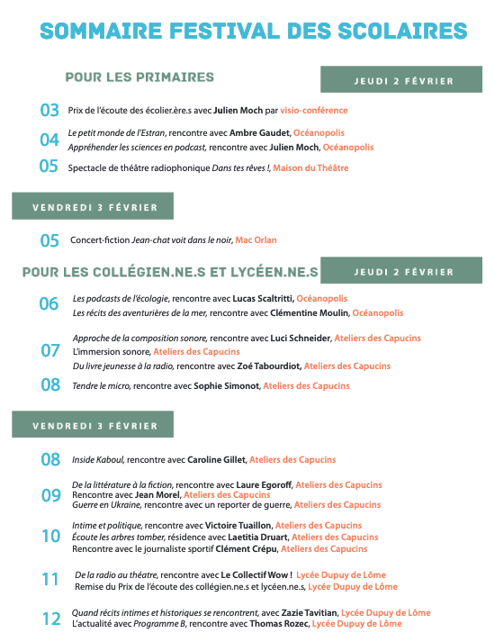 Depuis dix ans, les jeudi et vendredi du Festival Longueur d'ondes, les élèves et enseignants de Brest et alentours sont accueillis pour leur faire découvrir le monde de la radio et de l’écoute. Rencontres avec des journalistes, documentaristes, réalisateurs, séances d’écoute, fictions et spectacles radiophoniques, nous proposons un programme riche en découvertes et partage d’expériences entre professionnels du monde de la radio et élèves du primaire, secondaire et enseignement supérieur.
