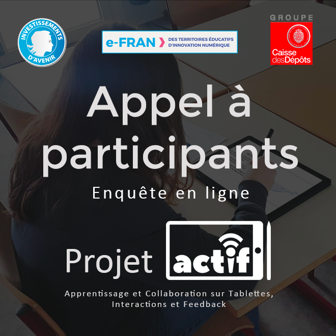 Cette enquête s'inscrit dans le projet ACTIF, soutenu par l’État dans le cadre du volet e-FRAN du Programme d’Investissement d’Avenir opéré par la Caisse des Dépôts. Le projet e-FRAN ACTIF vise à expérimenter des outils et méthodes pédagogiques qui facilitent l’apprentissage "actif" et "collaboratif" à partir de tablettes avec stylets.